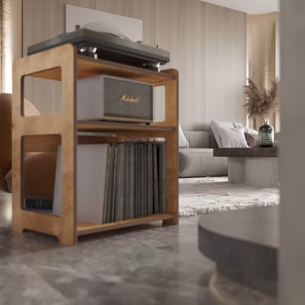 Crafted with meticulous attention to detail, our Vertex Record Player Stand & Vinyl Storage is constructed from high-quality Birch Plywood . We choose this material for its outstanding durability and the natural elegance of its grain, providing both lasting strength and visual appeal.